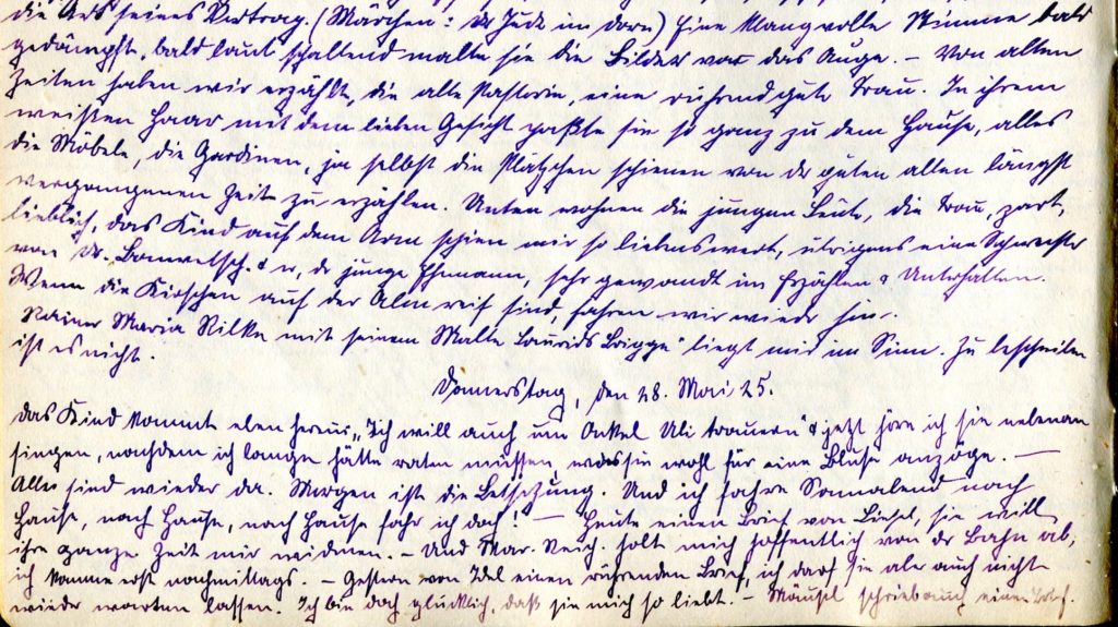 Ob Marie wohl Pfingsten in Hannover ist? Dieses Menschenkind schreibt mir überhaupt nicht! Und Anna, die Teure, hat die arme Idel wieder zwei Tage lang mit ihre und Lottes Schönheit geplagt. Alberne Reden!