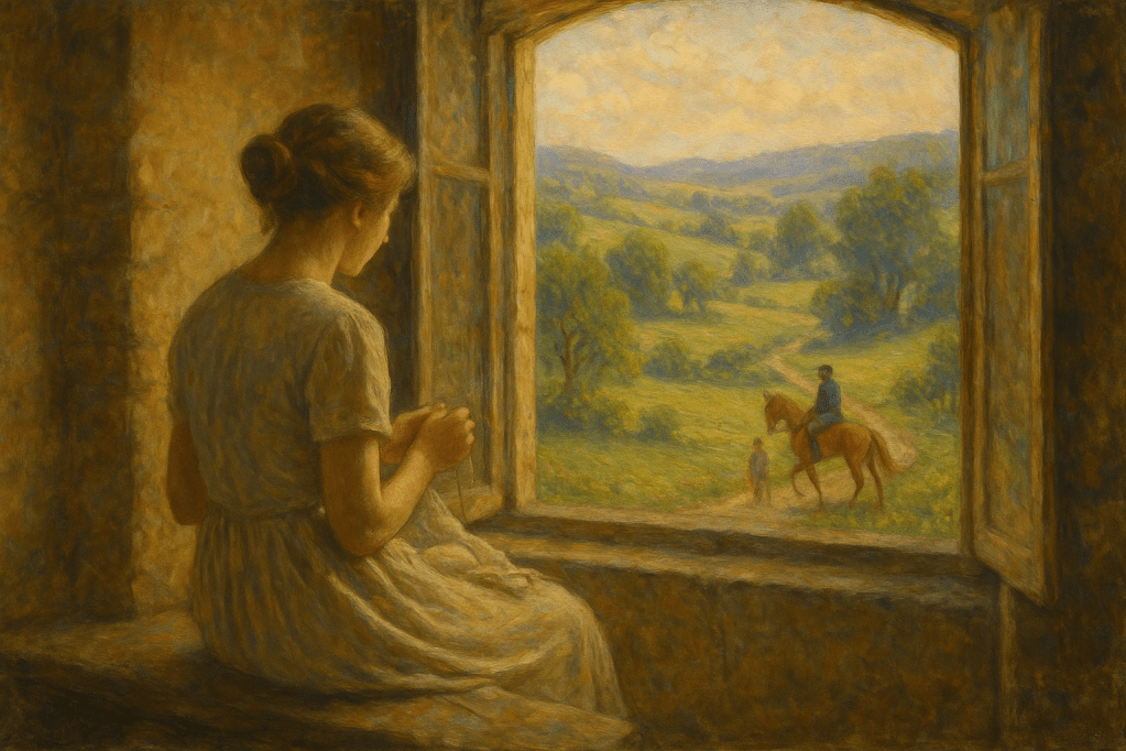 So wie gestern: ich saß auf der breiten Fensterbank und nähte Stich um Stich. Dann und wann schweifte mein Blick über das Land. Da! Plötzlich! Auf