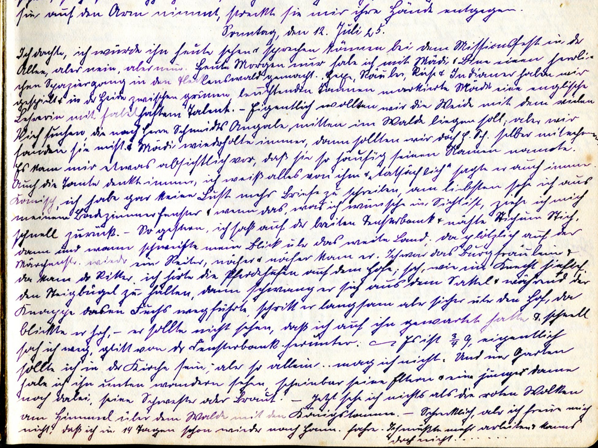 Eigentlich wollten wir die Weide mit dem vielen Vieh suchen, die nach Herr Schmidts Angabe, mitten im Wald liegen soll, aber wir fanden sie nicht. Mädi wiederholte immer wieder, dann sollten wir doch Herr Schmidt selber mitnehmen. Es kam mir etwas absichtlich vor, dass sie so häufig seinen Namen nannte. Auch meine Tante (Idel?) denkt immer, ich weiß alles von ihm. Und „tatsächlich“ sagte er auch immer so komisch.