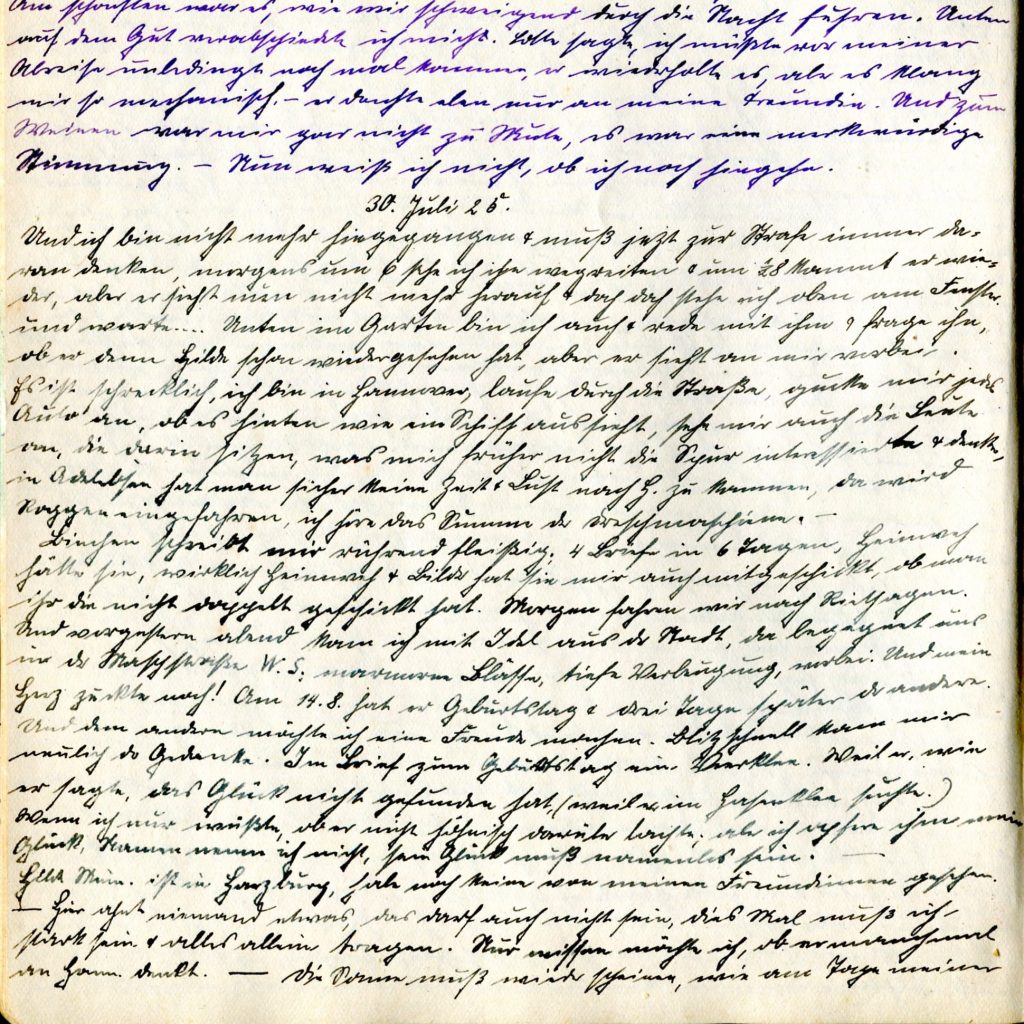 Der Baron fuhr mit mir bis Kreisen. Augen und Bemerkungen kann er machen, ich fasse alles scherzhaft auf. Und ausgefragt hat er mich nach Mariaspring. Und sogar, wann Herr Schmidt denn den Hof gemacht hätte, mir natürlich. Lachend sagte ich: „Nein, meiner Freundin.“