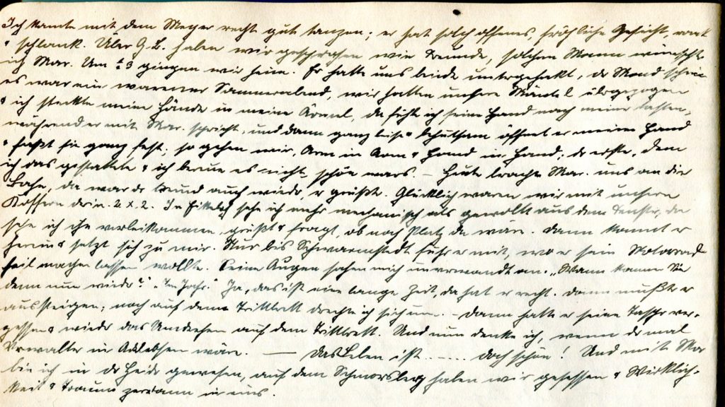 Um halb drei gingen wir heim. Er hatte uns beide untergehakt. Es war ein warmer Sonnabend mit Mondschein. Wir hatten die Mäntel übergezogen. Ich steckte meine Hände in die Ärmel, da spürte ich seine Hand nach meiner tasten, während er mit Marie sprach. Ganz leise und behutsam öffnete er meine Hand und hielt sie ganz fest. So gingen wir. Arm in Arm, Hand in Hand. Er war der erste, dem ich das erlaubte und ich bereue es nicht. Schön war es.