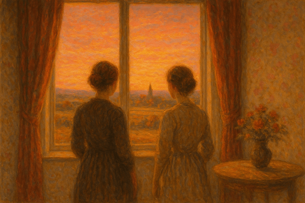 Eben ging die Sonne zur Ruhe. Ich habe mit Lotte einen weiten Gang durch die Felder gemacht. Da hat sie mir erzählt, dass sie heimlich verlobt ist. Ihre Eltern wollen das aber nicht, weil er arm ist. Trotzdem schreiben sie sich immer. Ich könnte sie darum beneiden.