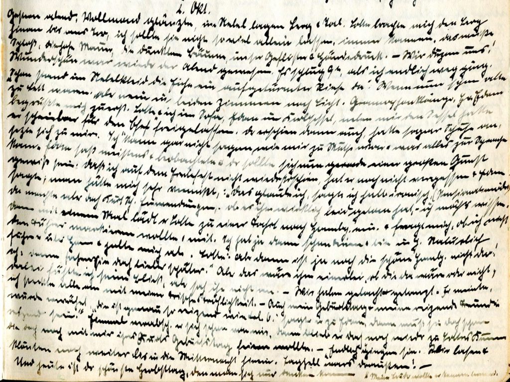 Gestern Abend glänzte der Vollmond, während Nebel über Berg und Tal lagen. Lotte begleitete mich den Berg hinauf bis ans Tor. Sie bat mich, sie nicht so oft allein zu lassen und immer wieder zu kommen. Das weiße Schloss, die hohe Mauer, die dunklen Bäume, unser Geflüster und Händedruck. Wir duzen uns jetzt! Wunderschön war der Abend.