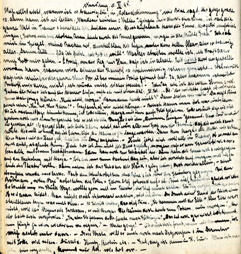 Dann kamen Marga und ihre Mutter wieder und wir klönten noch etwas. Als er kam und mir die Hand gab, habe ich ihn lange angesehen. Heute, jetzt, sind wohl alle im Theater. Ob er mal an mich denkt? Ich glaube kaum. Heute habe ich ihm nicht die Hand gegeben.