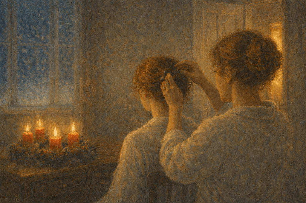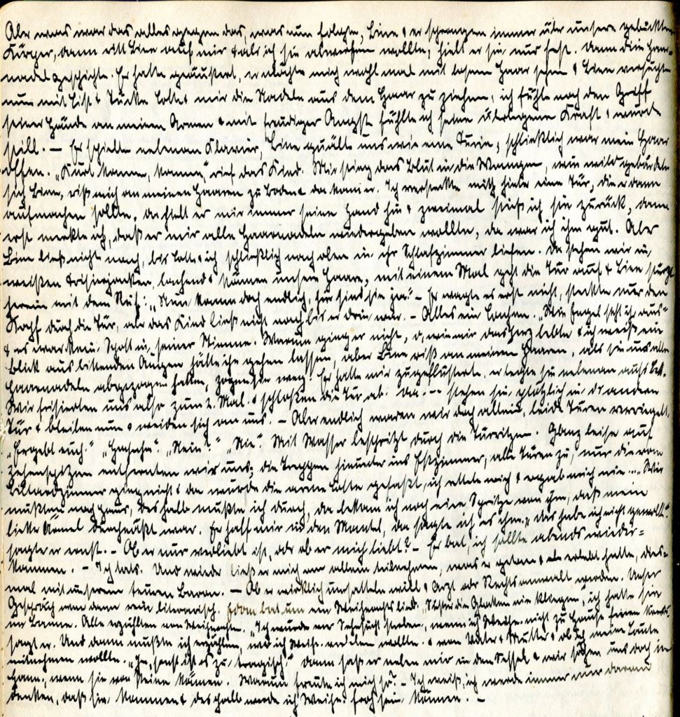 Am Ofen, in schönem Seifenwasser, wuschen Bine und ich uns. Aus dem Herrenzimmer klang seine Stimme herüber. Alle trabten in unser kleines Zimmer, viel Neckerei, und die weiße Decke wurde gespannt. Da geht hinter mir die Tür auf. Erst, als Lotte sagte: „Da amüsiert sich einer“, drehte ich mich um. Ich sah aber gleich wieder auf meine Decke. Er ging um den Teppich herum, so dass er mir gegenüberstand. Ich bekam die Nadeln kaum richtig gefasst, wenn er so auf meine Hände sah. Eine solche Ausdauer im Stricken hätte er mir nicht zugetraut und die vielen Fehler werde man wohl erst nachher sehen. Da holte ich gerade zu einer Backpfeife aus, als er lachend weiterrutschte.