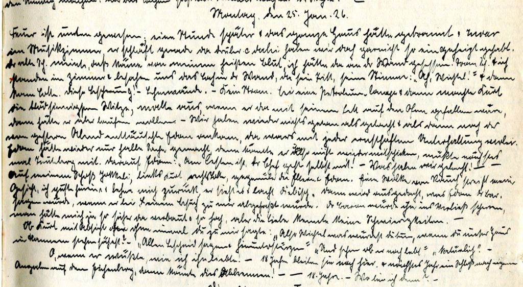 Feuer ist unten gewesen. Eine Stunde später und das ganze Haus hätte gebrannt. Und zwar im Musikzimmer. Er schläft gerade darüber, und dabei haben wir doch gar nicht so eingeheizt gehabt. Der alte Schmidt meinte, das käme von meinem heißen Blut, ich hätte da an der Wand gesessen. Frau Schmidt und ich standen im Zimmer und besahen uns das Lecken der Wand, da sein Tritt, seine Stimme: „Ach, Wichtel.“ Und dann kam Lotte. Diese Beschauung!