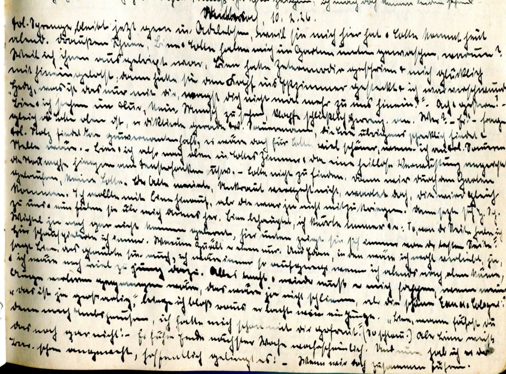 Bine und ich stehen im Flur, kein Mensch zu sehen. Schließlich klopft jemand ans Herrenzimmer. Wer? Er! Er fragt gleich, ob Lotte oben ist. Er diktierte gerade Fräulein Sauermann, die Lene übrigens schrecklich findet. Fräulein Stolz findet nun, ganz gouvernantenhaft, es wäre doch für Lotte viel schöner, wenn ich an Fräulein Sauermanns Stelle wäre.