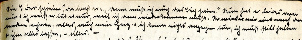 Lotte und ich gingen auf ihr Zimmer. Sie las mir wieder einen Brief von ihm vor, dann holten wir mein Garn. Als wir die Treppe hinunterkamen, traten gerade Lisa und Kurt aus dem Herrenzimmer. Sie wollten in die „Nälle“. Ob er meine Gedanken weiß? Er kam auf mich zu, fasste mit beiden Händen meine Schultern, sah mich an und sagte: „Aber nicht weggehen, hierbleiben.“