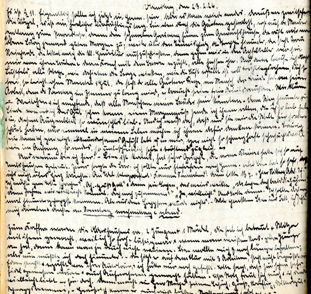 Es ist halb elf. Eigentlich sollte ich jetzt in Hannover sein, aber es kam wieder anders. Draußen zwitschern die Vögel. Es ist ein fröhlicher Vorfrühlingstag. Eben bin ich durch die Gärten gestreift: erst auf der Mauer entlang zum Paradies, dann den schmalen Grasweg hinauf zum Gewächshaus. Vom oberen Berg rief mir jemand einen guten Morgen zu. Weiter ging ich über den Tennisplatz, die Treppe hinunter – dort stand Frau Reinhardt und bat mich, die kleine Haustür aufzuschließen. Wir gingen in den Apfelkeller, wo sie mir von ihren Brüdern und ihrem Streit mit dem Baron erzählte. Alle hatten sie es mit ihm.