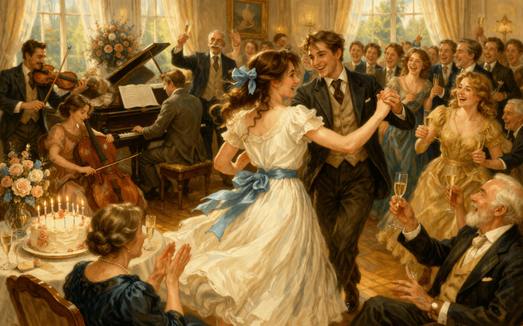 Mit Schleife im Haar ging ich hinunter. Herr Schmidt spielte, Lotte öffnete die Tür. Wir sprangen hinein. Wein, Musik, Stimmen: „reizend“, „entzückend“. Wir spielten. Edams Hände hielten mich fest. Die Blicke aller. Er drehte sich am Klavier um, sah mich an.