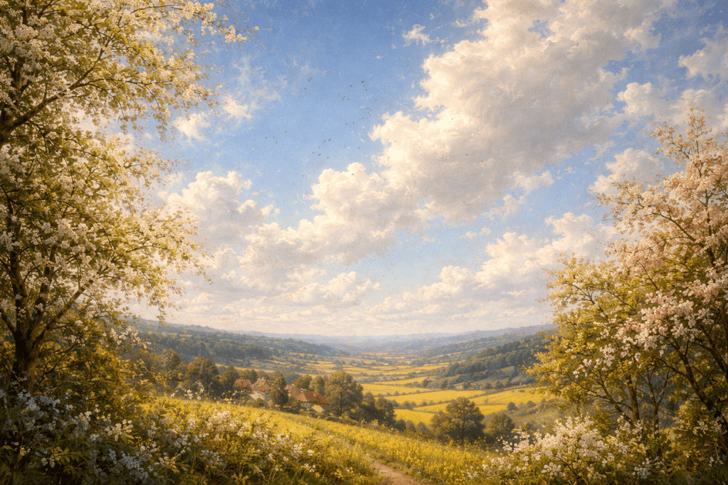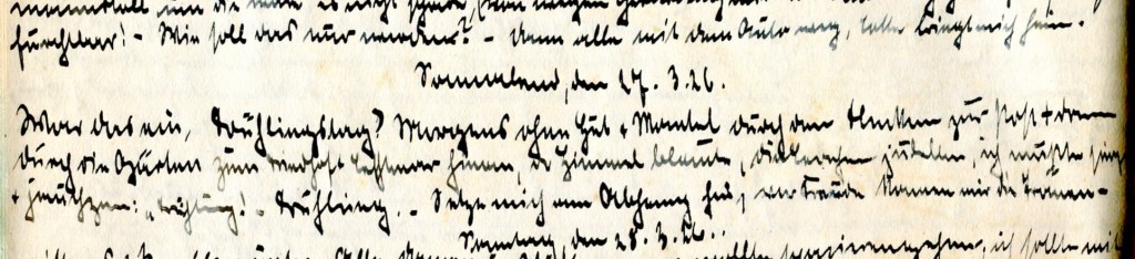 Morgens bin ich ohne Hut und Mantel durch den Flecken zur Post gegangen. Dann durch die Gärten zum Freidhof. Den Lechtmar hinab, der Himmel blaute, die Lerchen jubelten, ich müsste singen und jauchzen: „Frühling!“